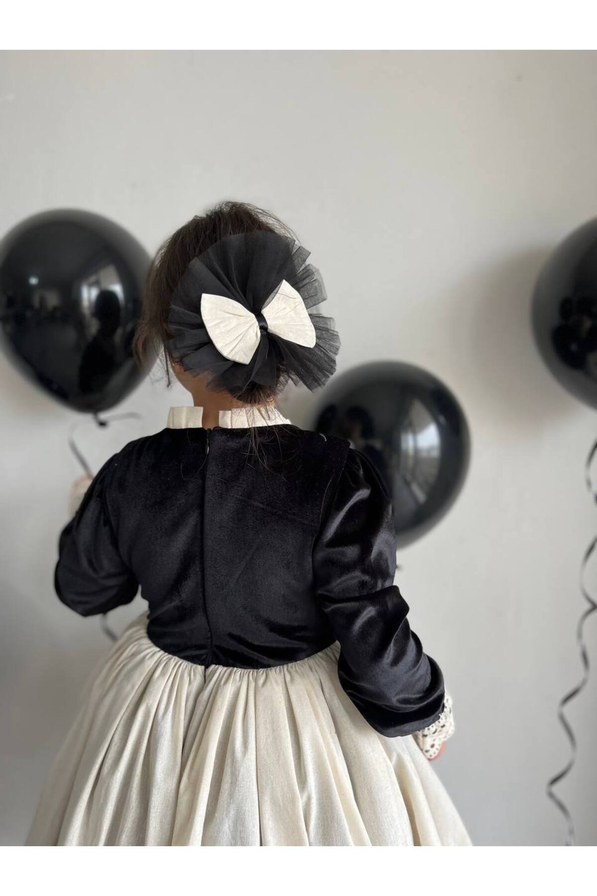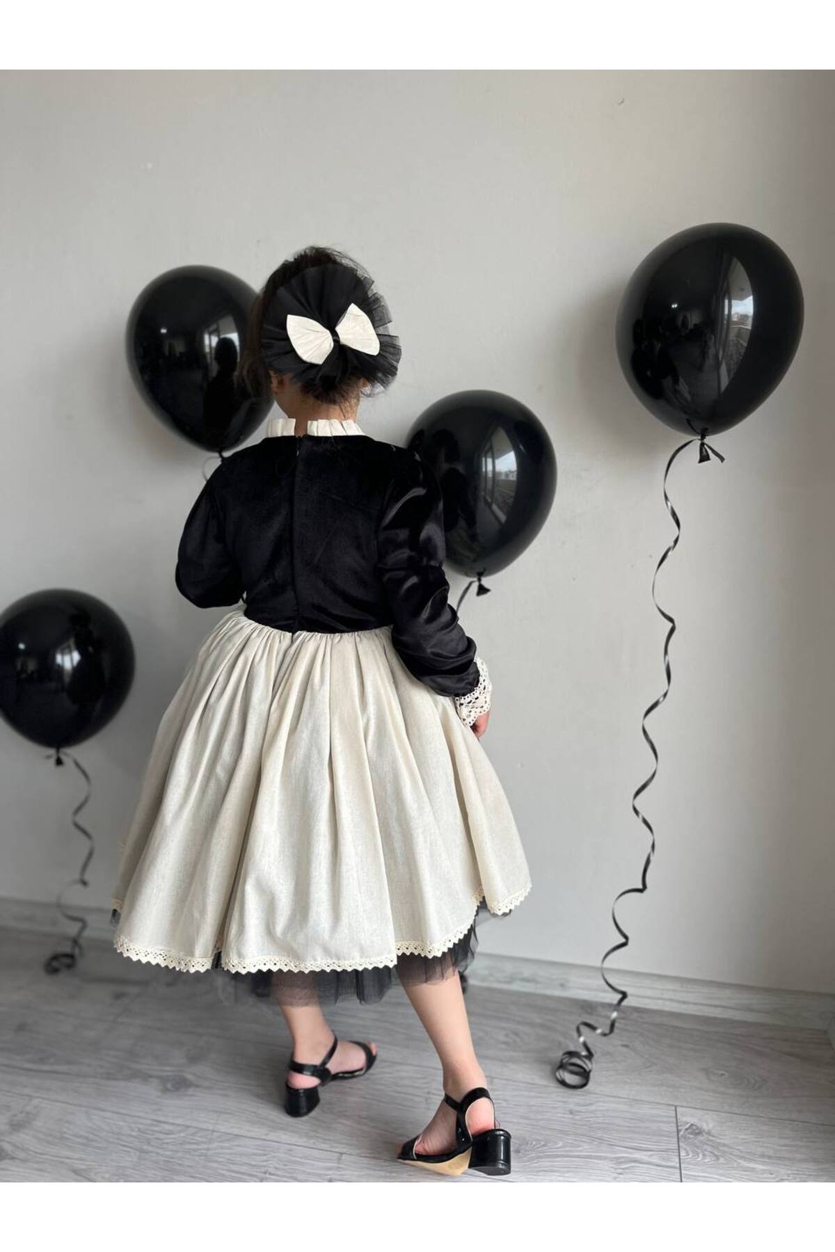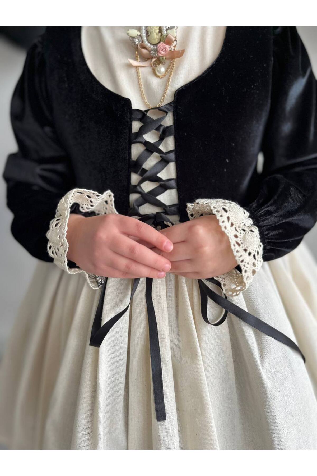 Kız Çocuk Premium Deluxe Siyah Kadife Bağcıklı Yelek Detaylı Özel Gün Cosplay Elbisesi + Toka