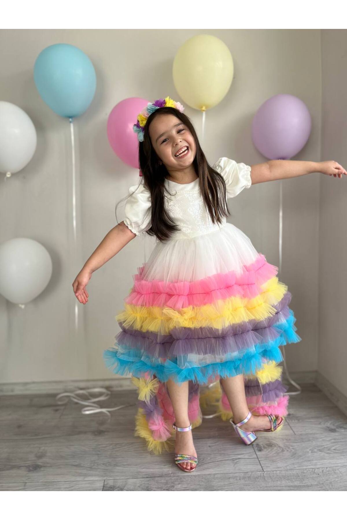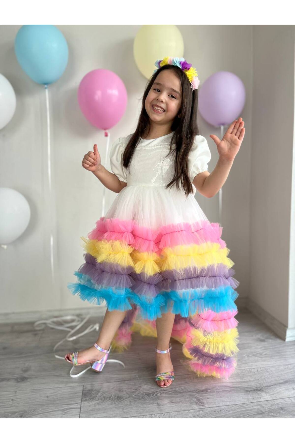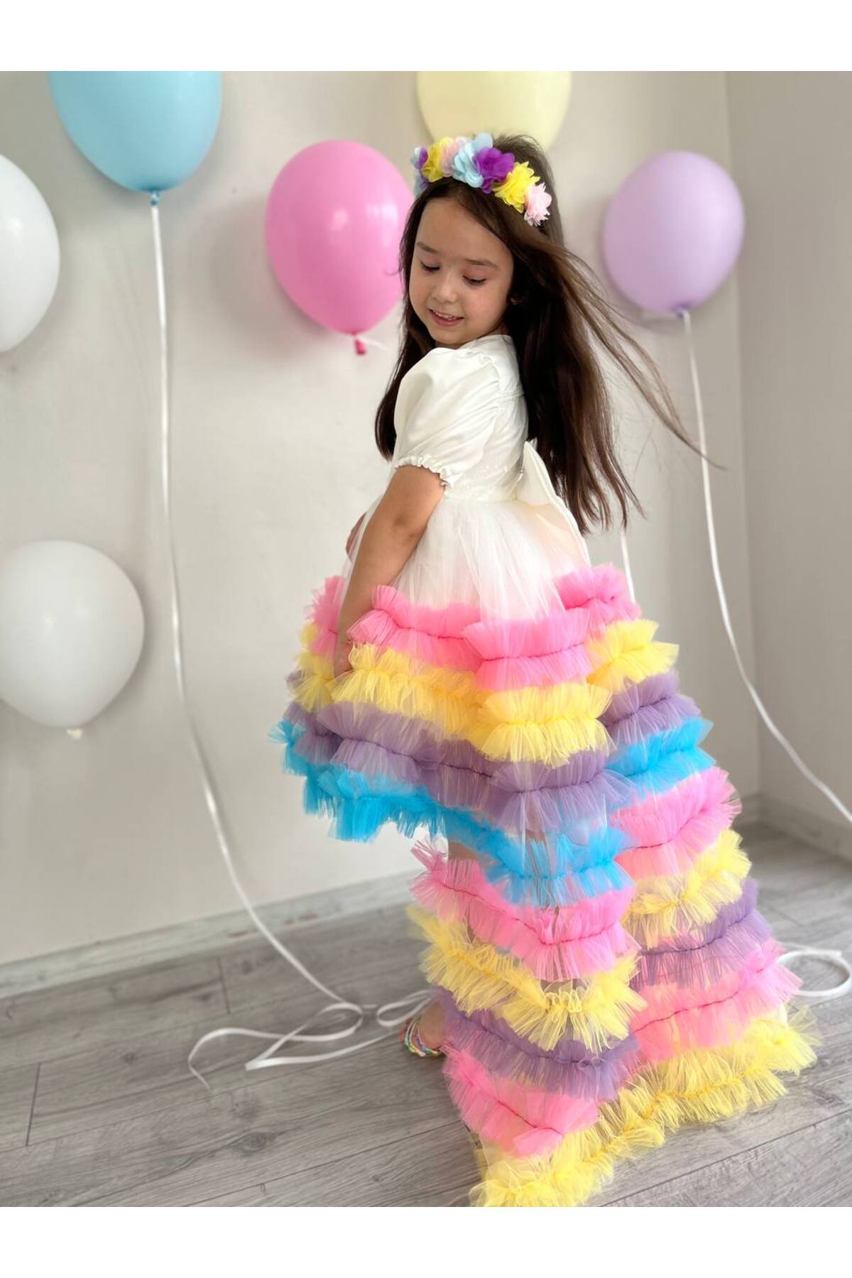 Kız Çocuk Unicorn Renkli Kuyruklu Prenses Parti Elbisesi + Toka