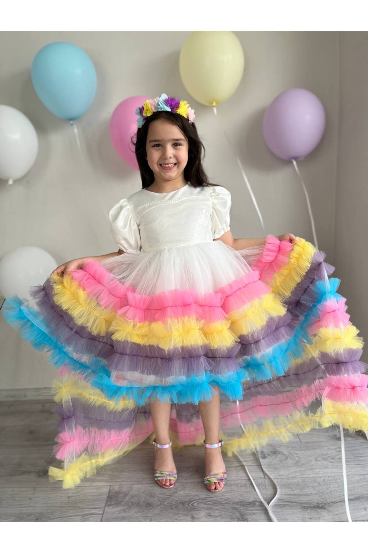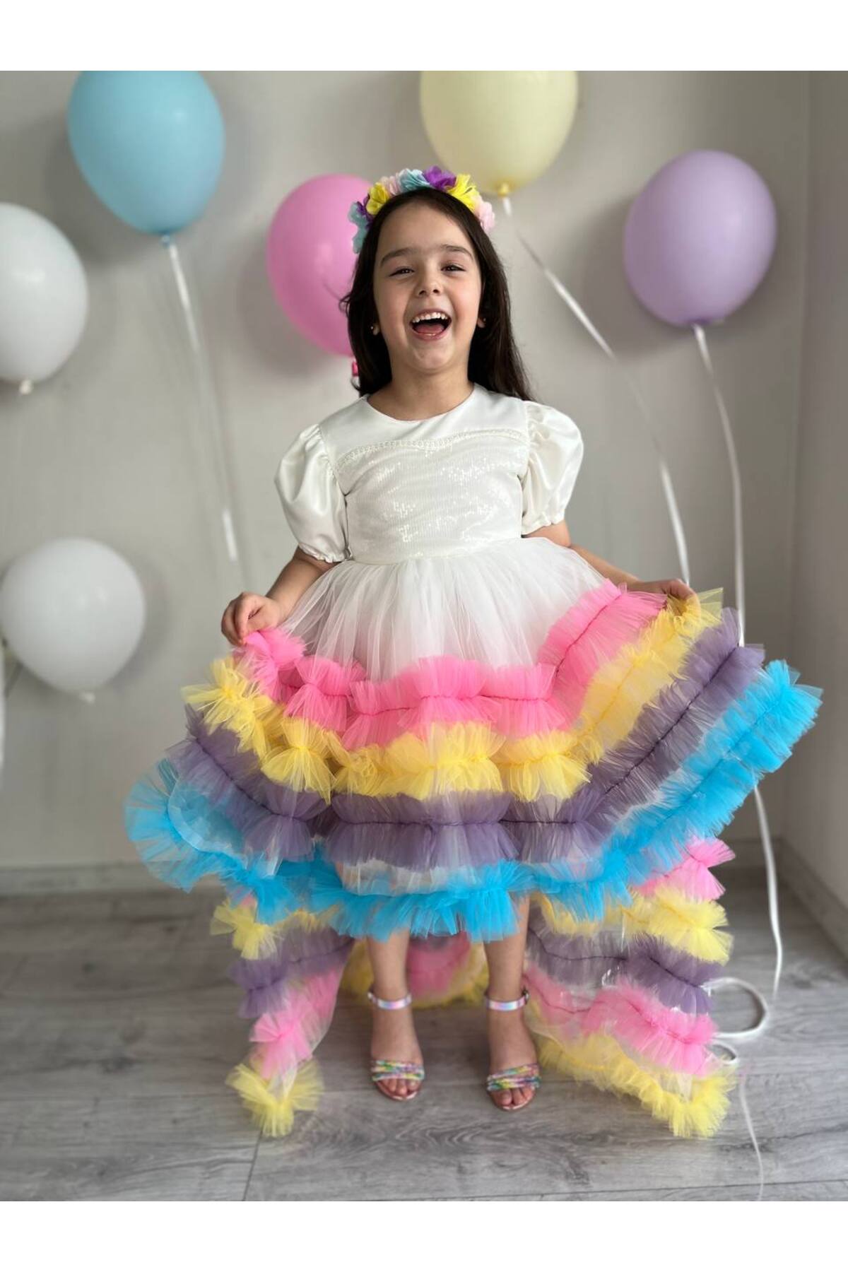 Kız Çocuk Beyaz Balon Kol Detaylı Kuyruklu Prenses Abiye