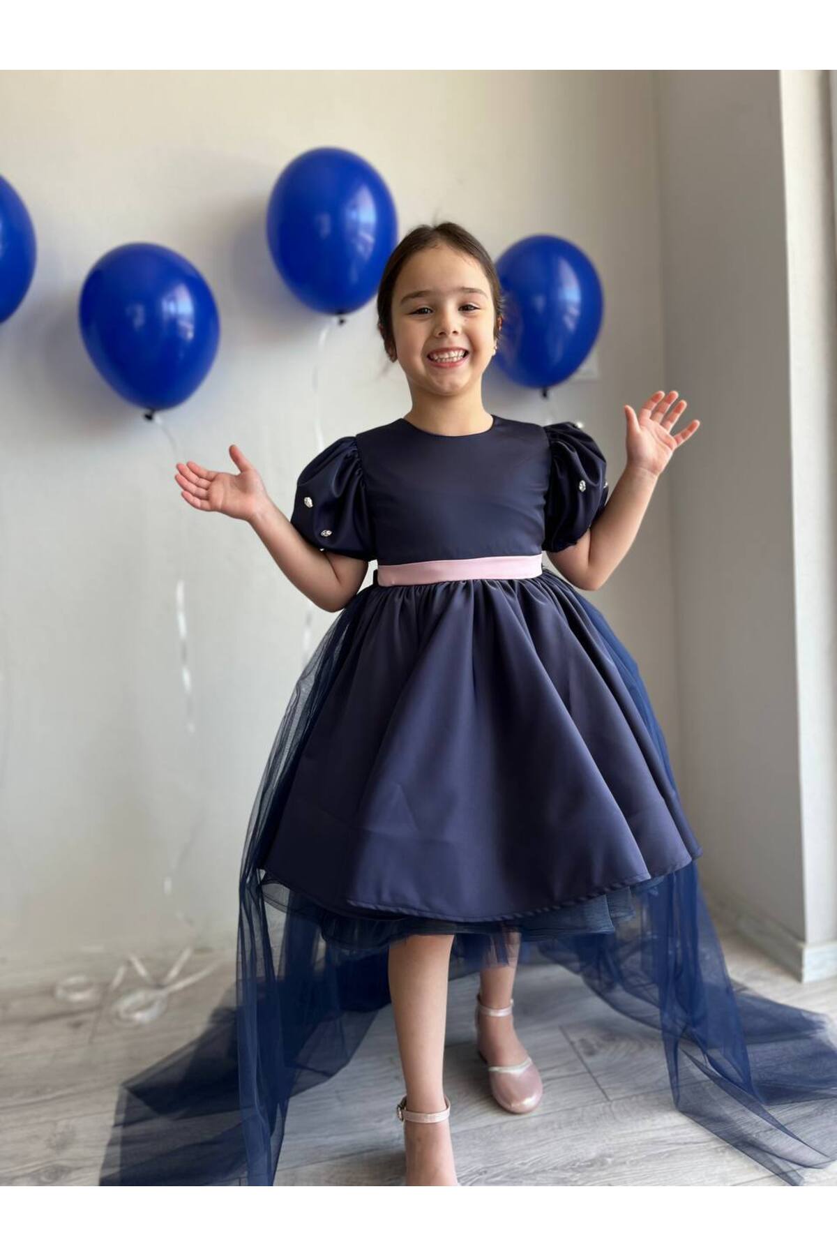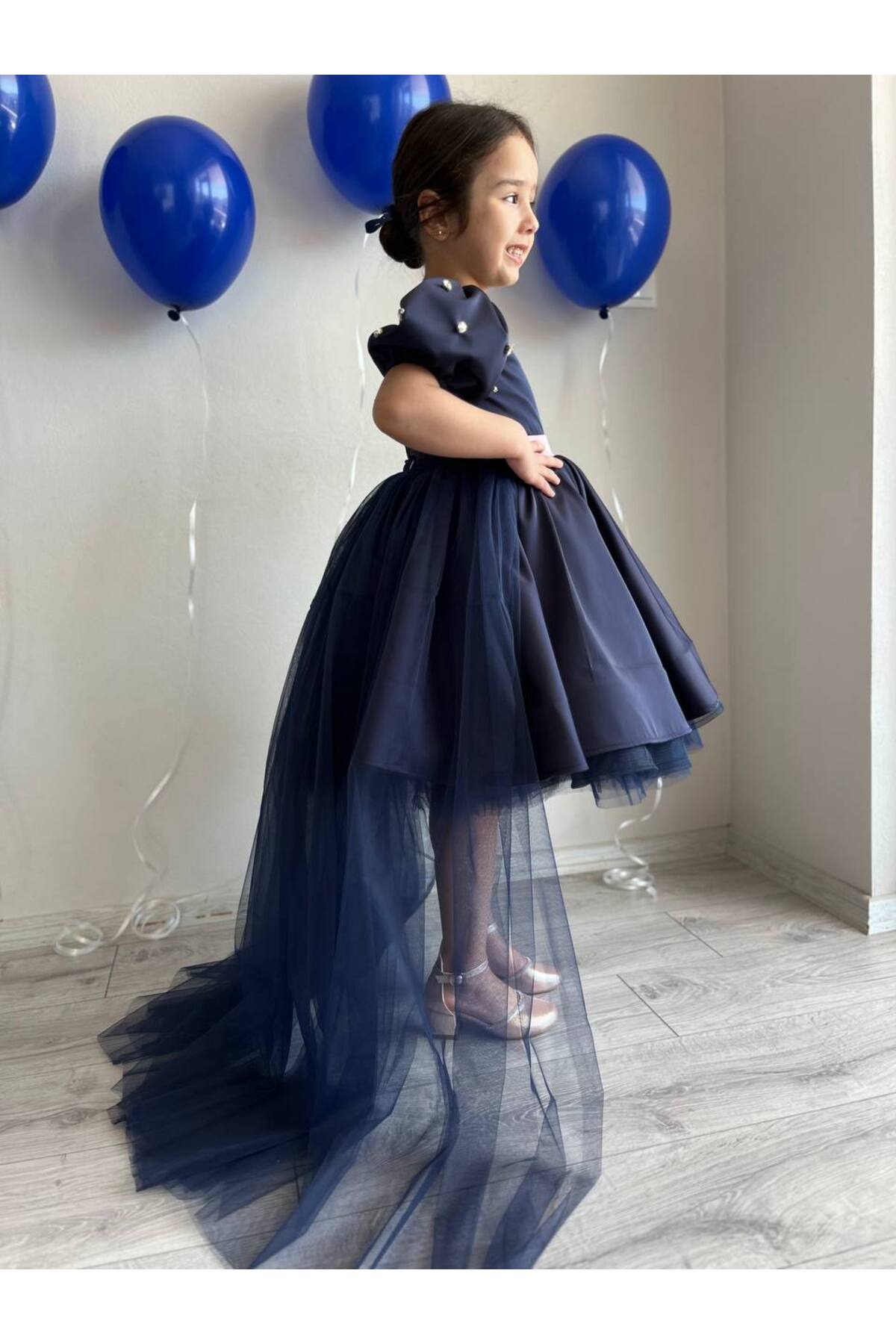 Lacivert Tak-Çıkar Kuyruklu Kız Çocuk Abiye, Sırt İp Detaylı Düğün Elbisesi