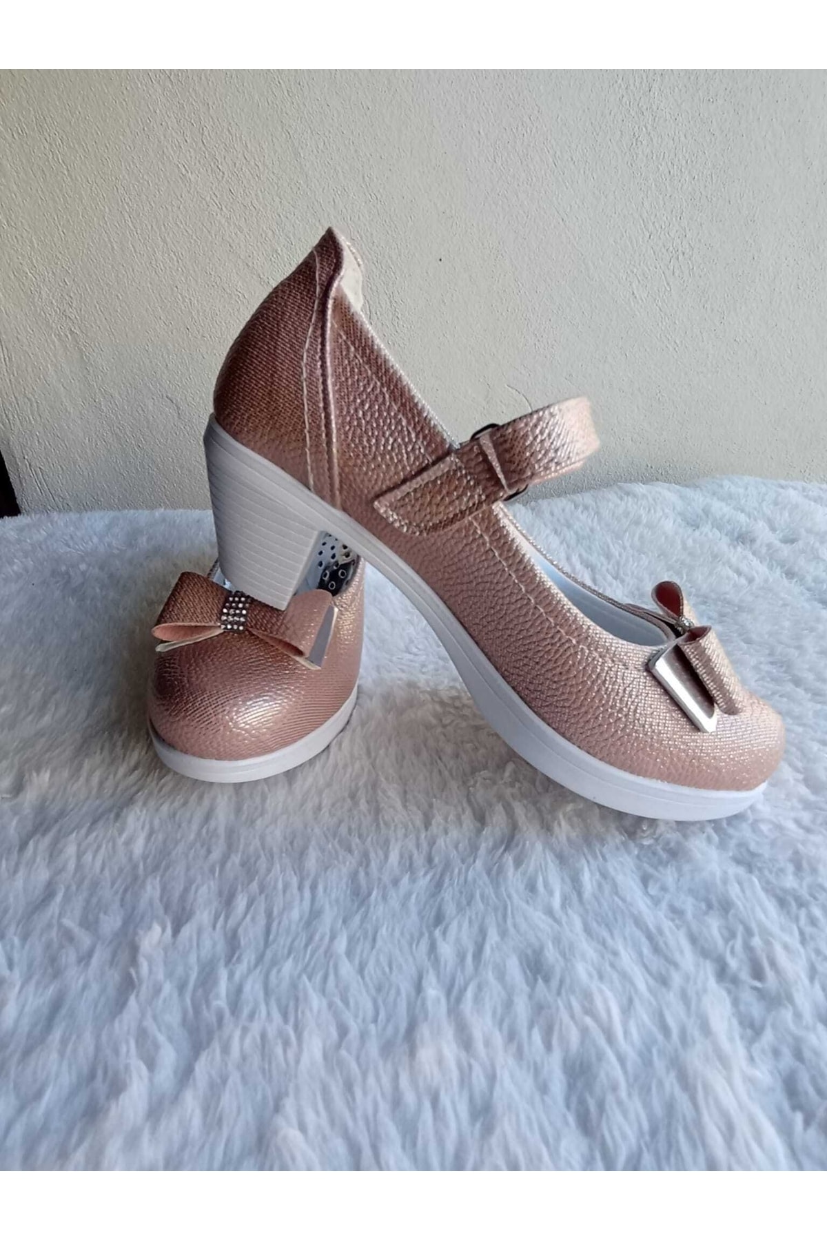Kız Çocuk Pembe Dokulu Fiyonk Topuklu Abiye Ayakkabı