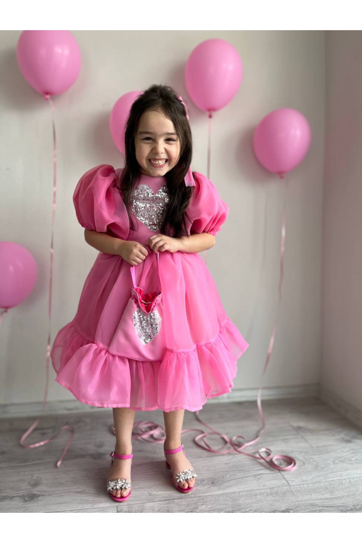 Kız Çocuk Pembe Kalp ve Fırfır Detaylı Karolin Prenses Doğum Günü Abiye Elbise + Çanta+ Toka