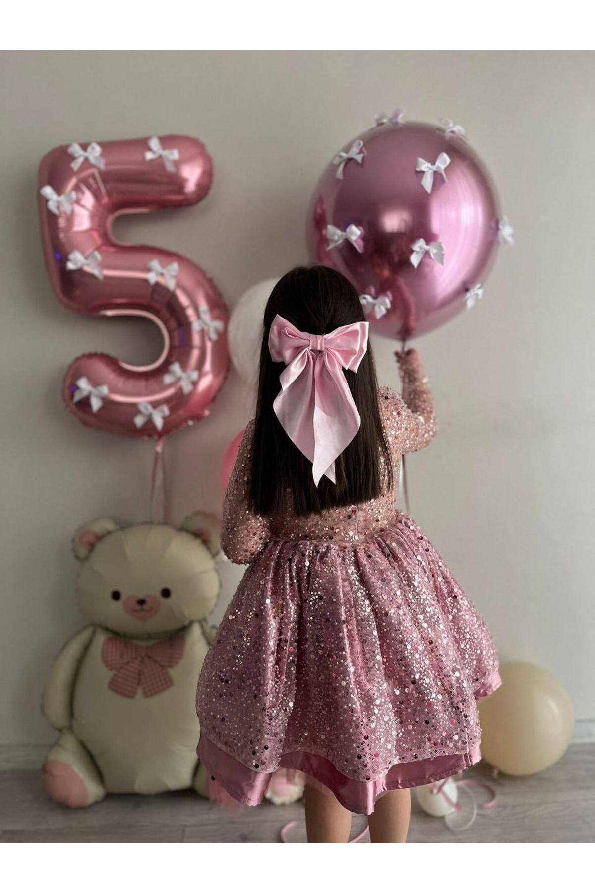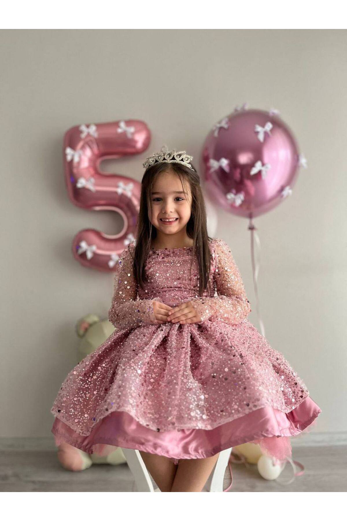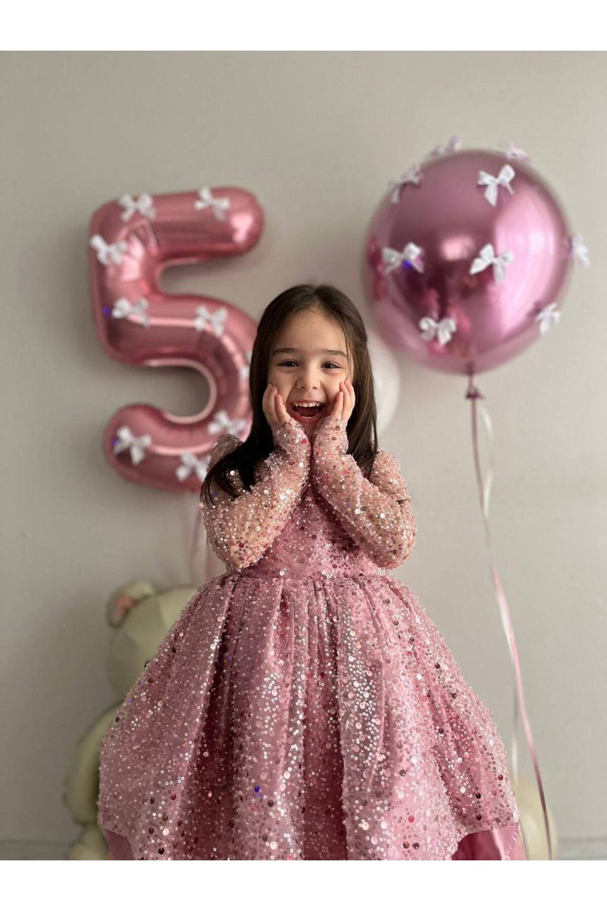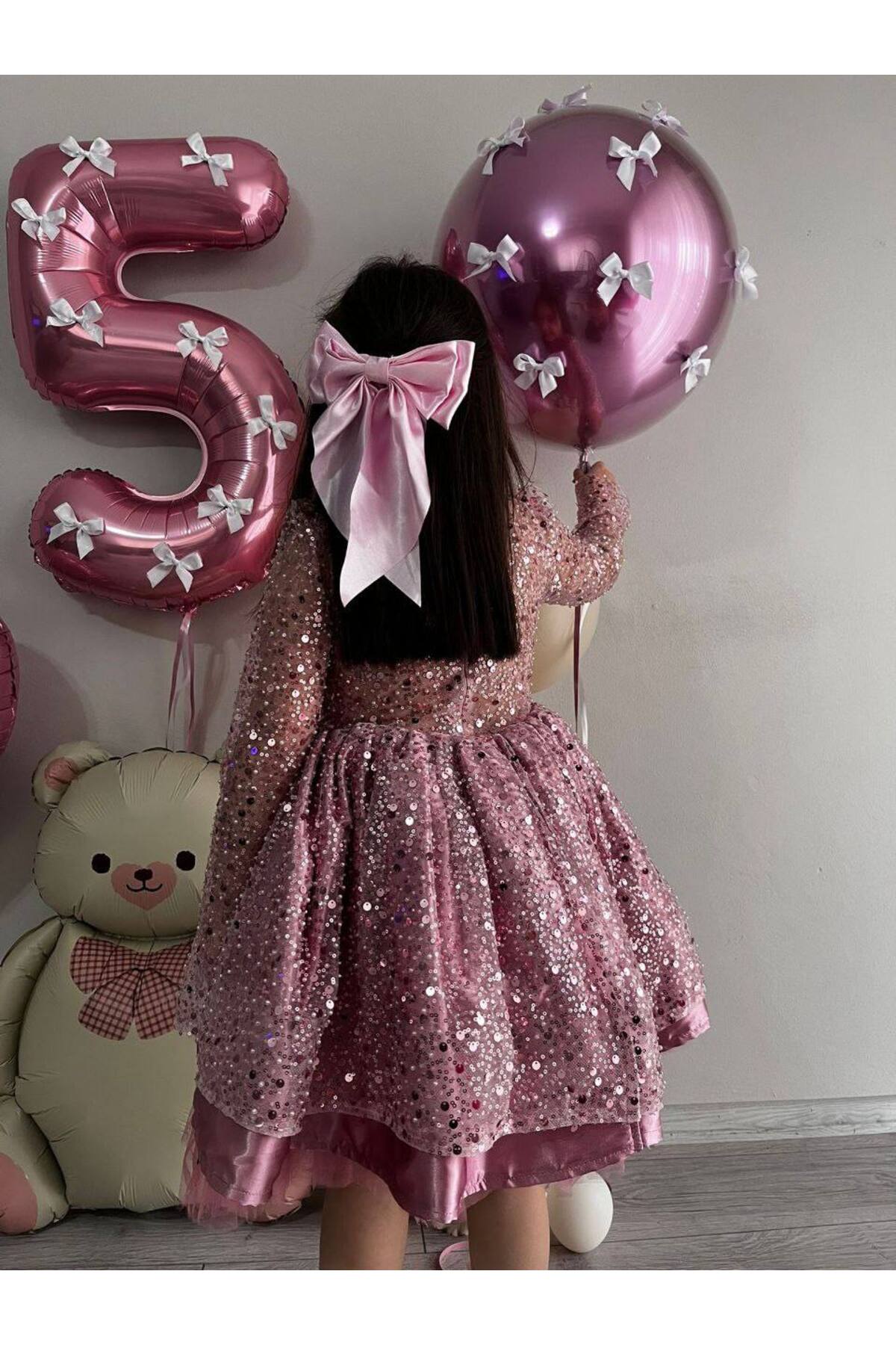 Kız Çocuk Pudra Pembe Sıvama Boncuk Tül Doğum Günü Parti Elbisesi, Bebek Düğün Abiyesi + Toka